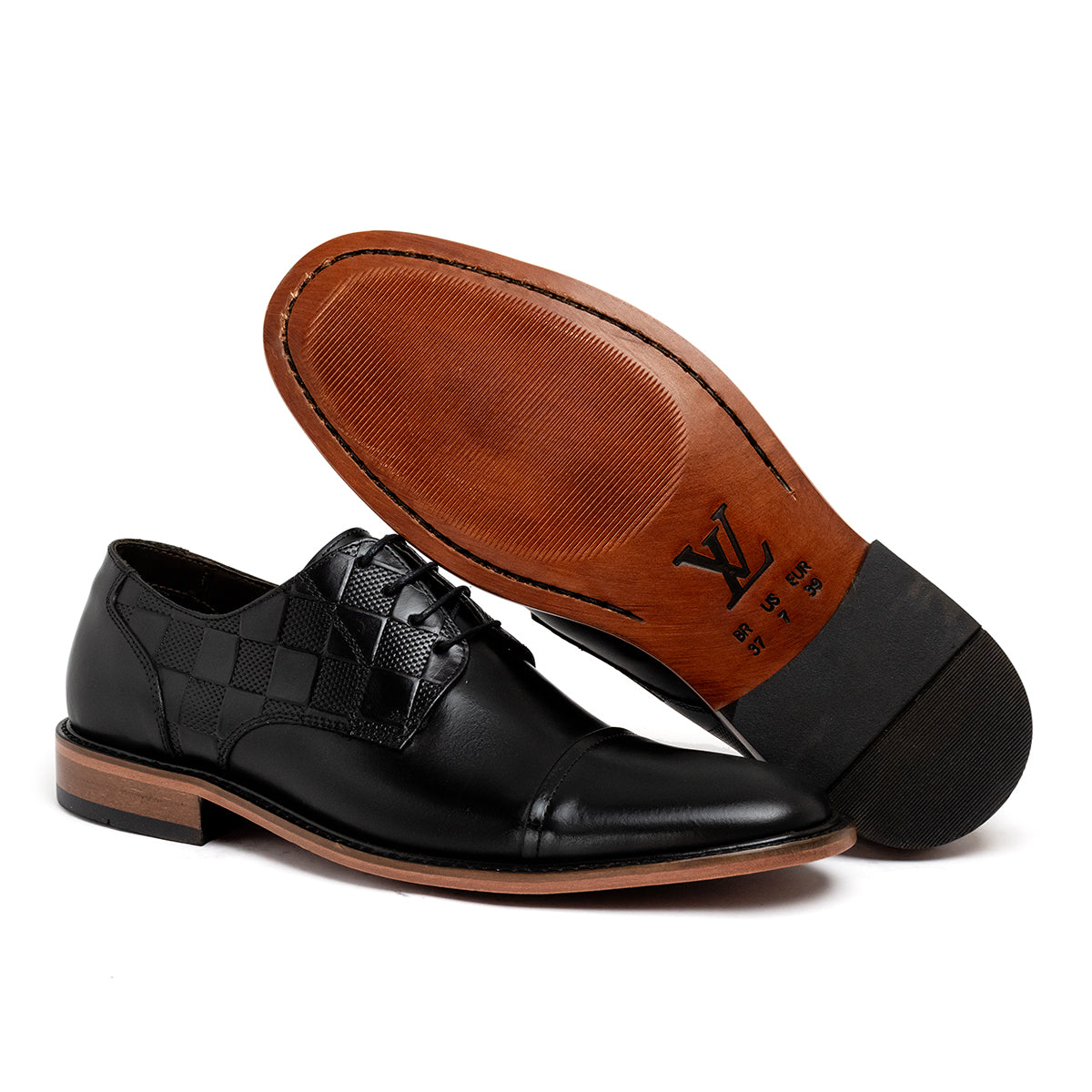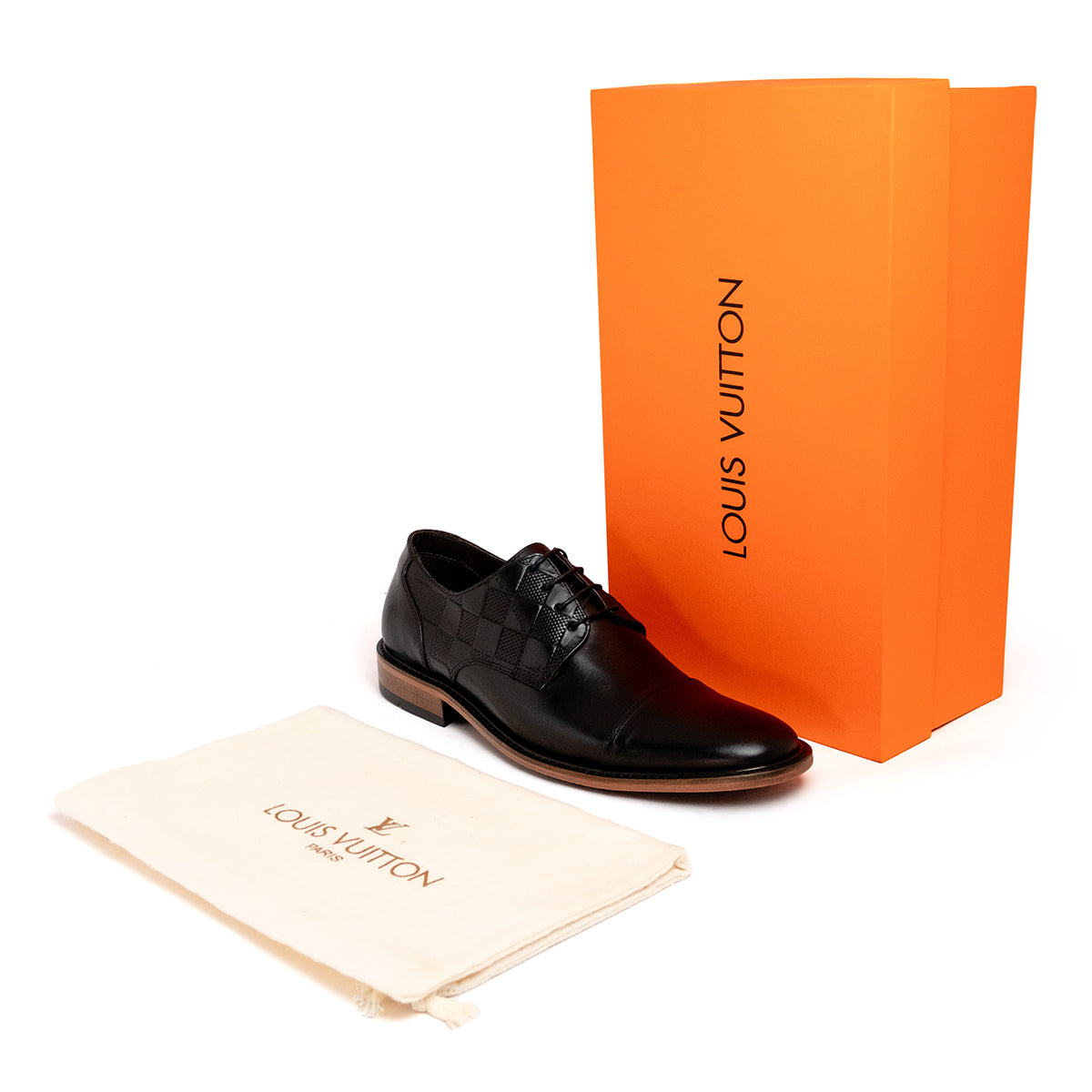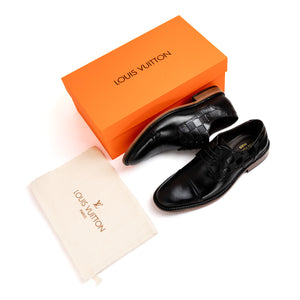 O derby Discovery é confeccionado em couro de vitelo envernizado com laterais discretamente impressas com o histórico padrão Damier da Louis Vuitton. Este clássico calçado de amarrar traz uma palmilha acolchoada e segue a tradicional construção Blake para garantir flexibilidade e conforto. É finalizado com um solado emborrachado resistente e antiderrapante.