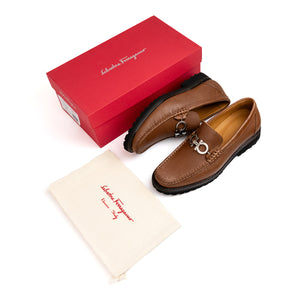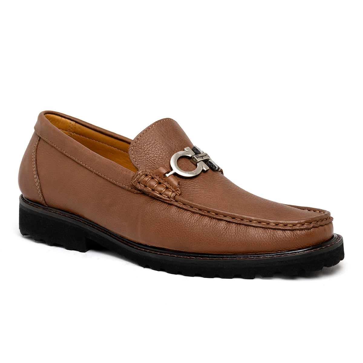 Fivela Gancini, bico quadrado, solado tratorado de borracha e solado de couro com logo. Cor: Preto.
