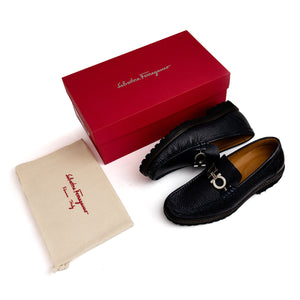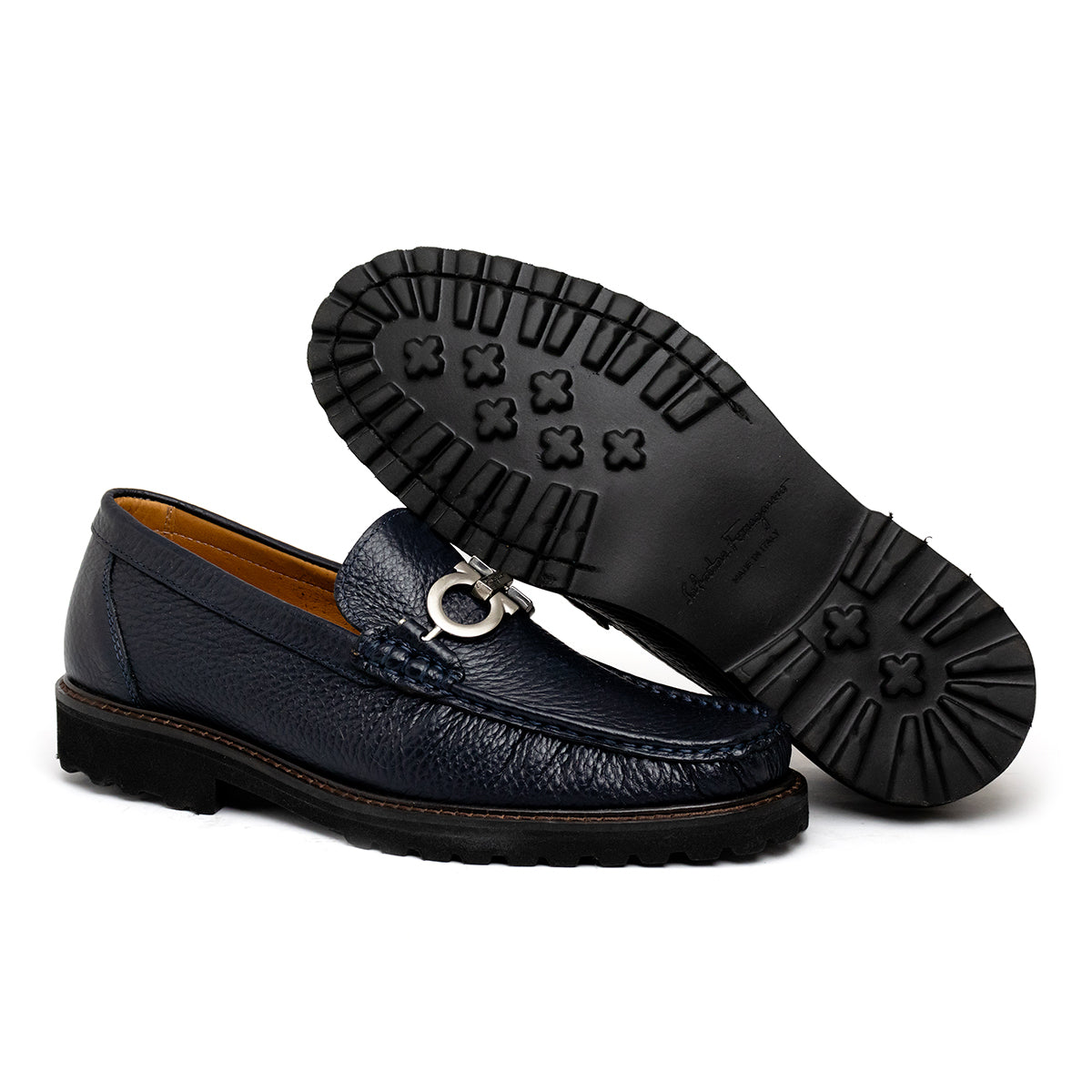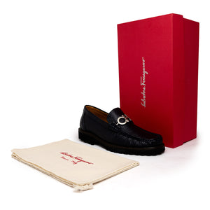 Fivela Gancini, bico quadrado, solado tratorado de borracha e solado de couro com logo. Cor: Preto.