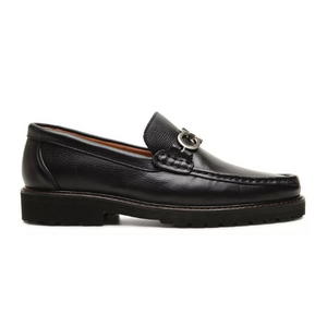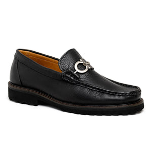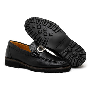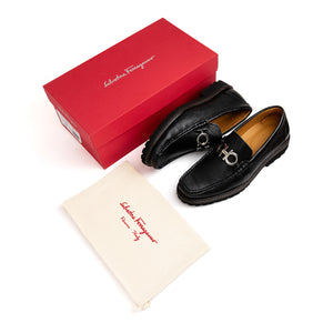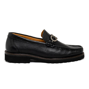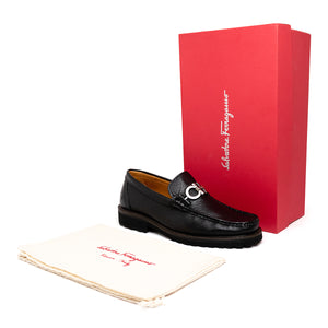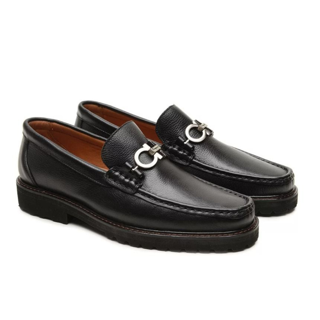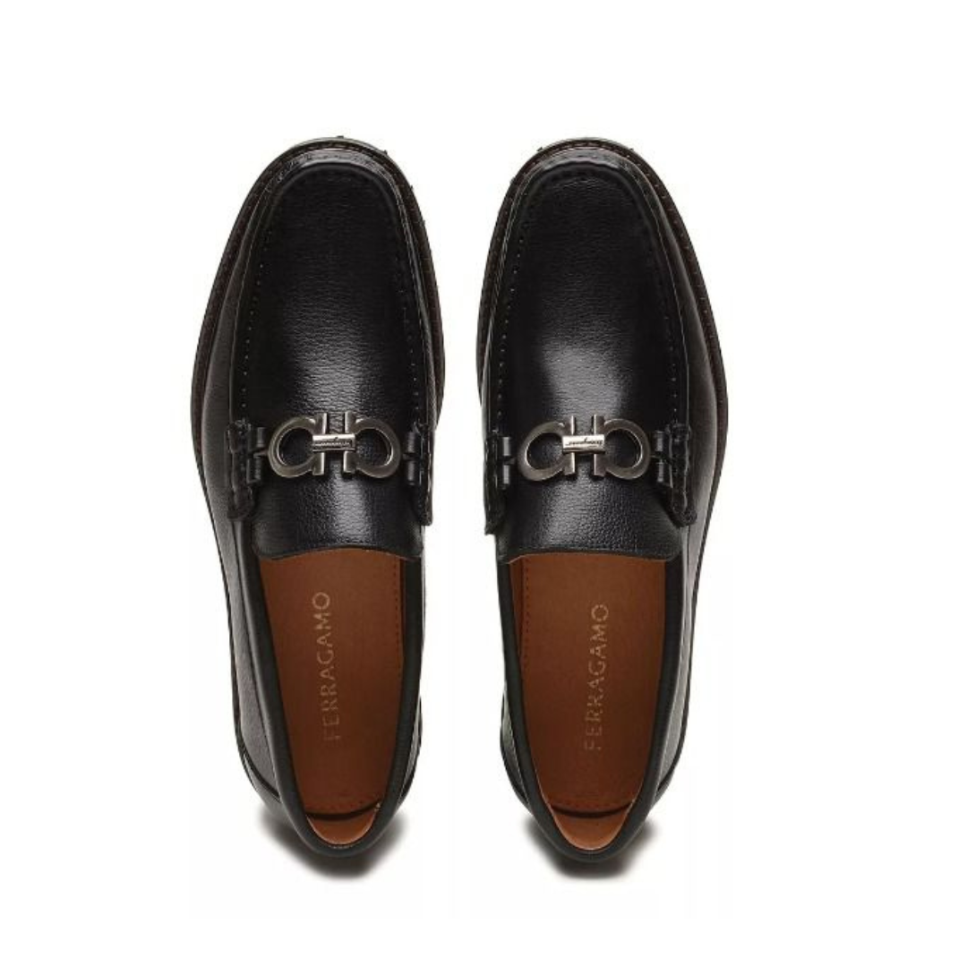 Fivela Gancini, bico quadrado, solado tratorado de borracha e solado de couro com logo. Cor: Preto.